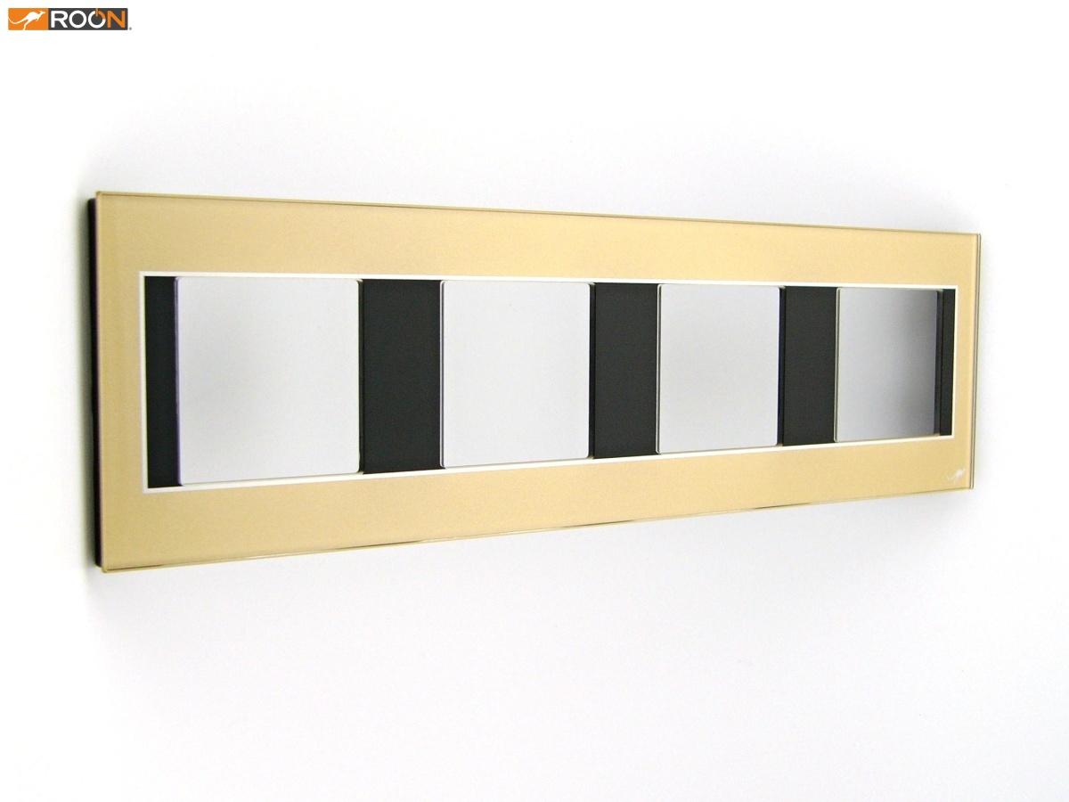 4-násobný rámeček z tvrzeného leštěného skla, pro modulární systém zásuvek a vypínačů ROON. Barva černo/zlatá